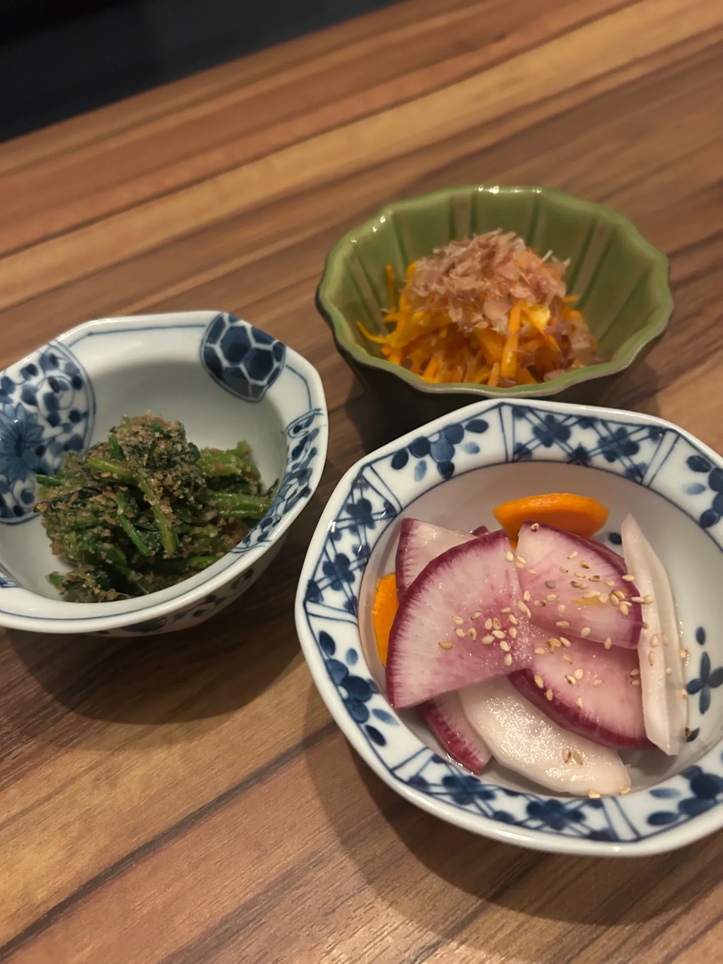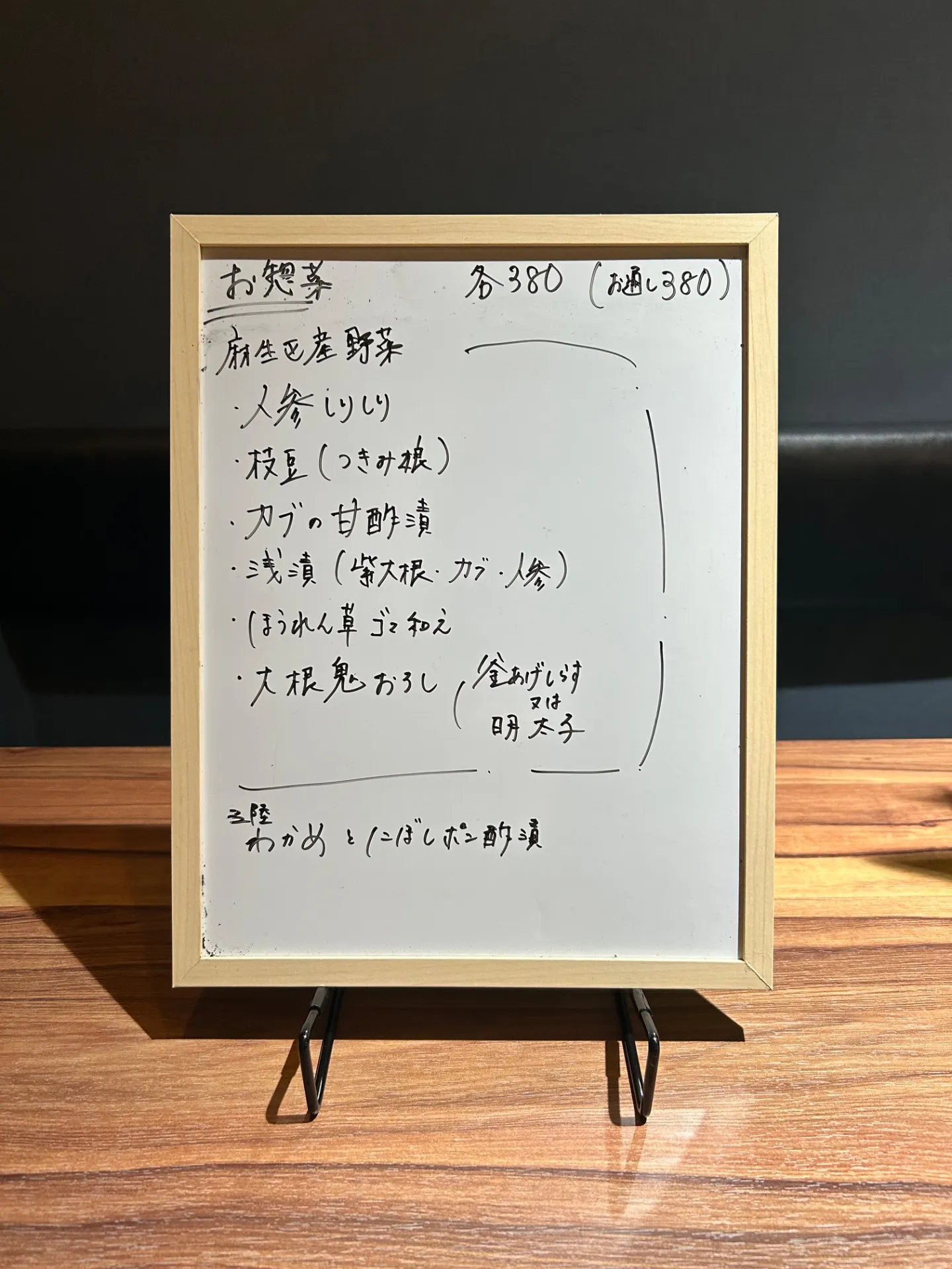 当店ではお惣菜メニューからお通し(380円)としてお好きなものを1品選んでいただいてます。