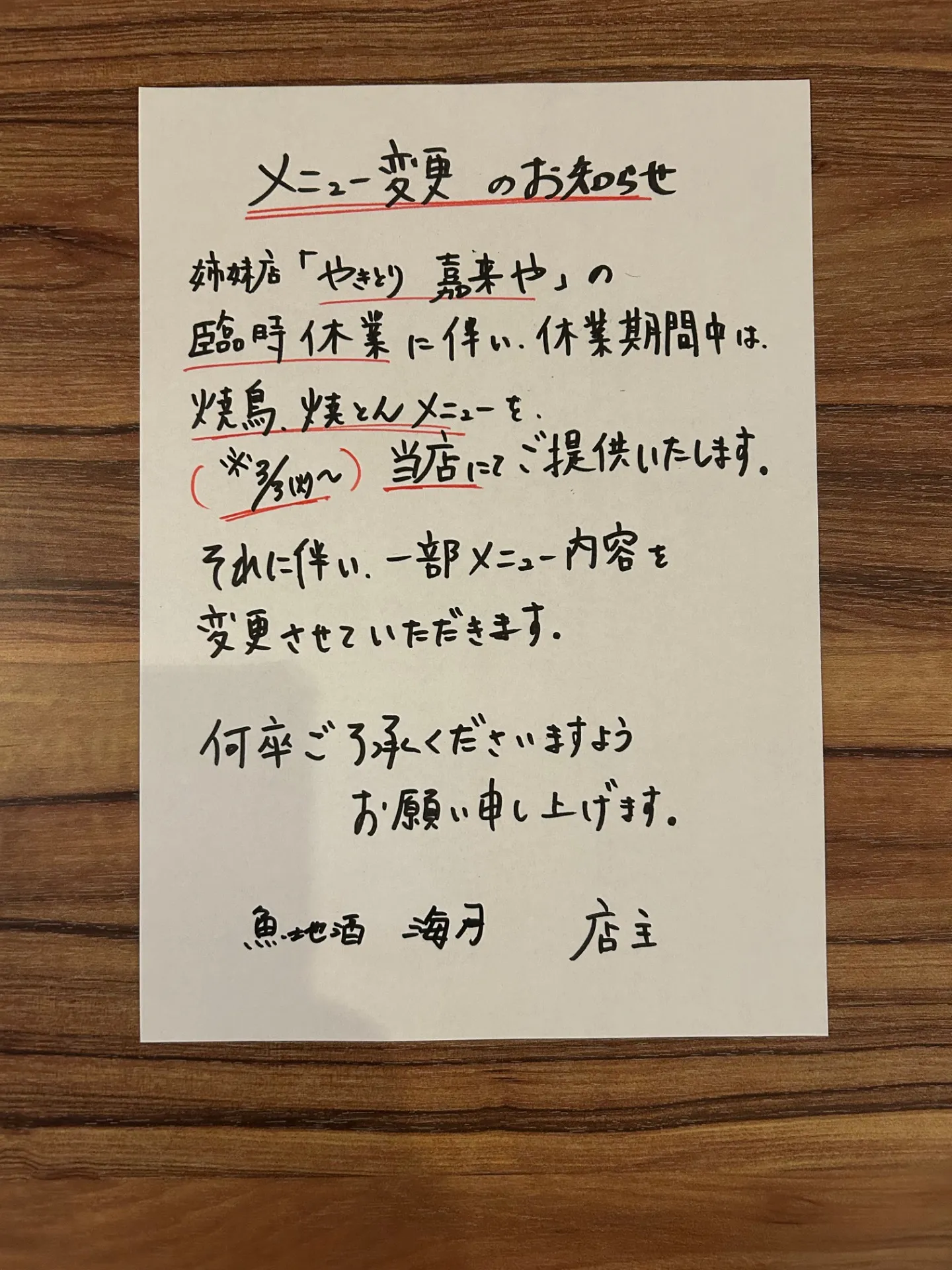 姉妹店「やきとり 嘉来や」の臨時休業に伴い、3月3日(火)より当面の間、焼き鳥・焼きとんメニューを当店にてご提供いたします。